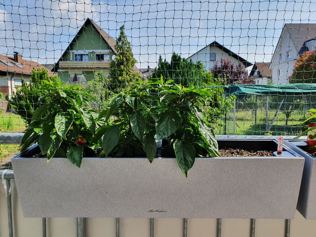 Um den Chilis Raum zum entfalten zu geben, sind die jetzt in Balkon Blumentöpfe umgetopft worden.